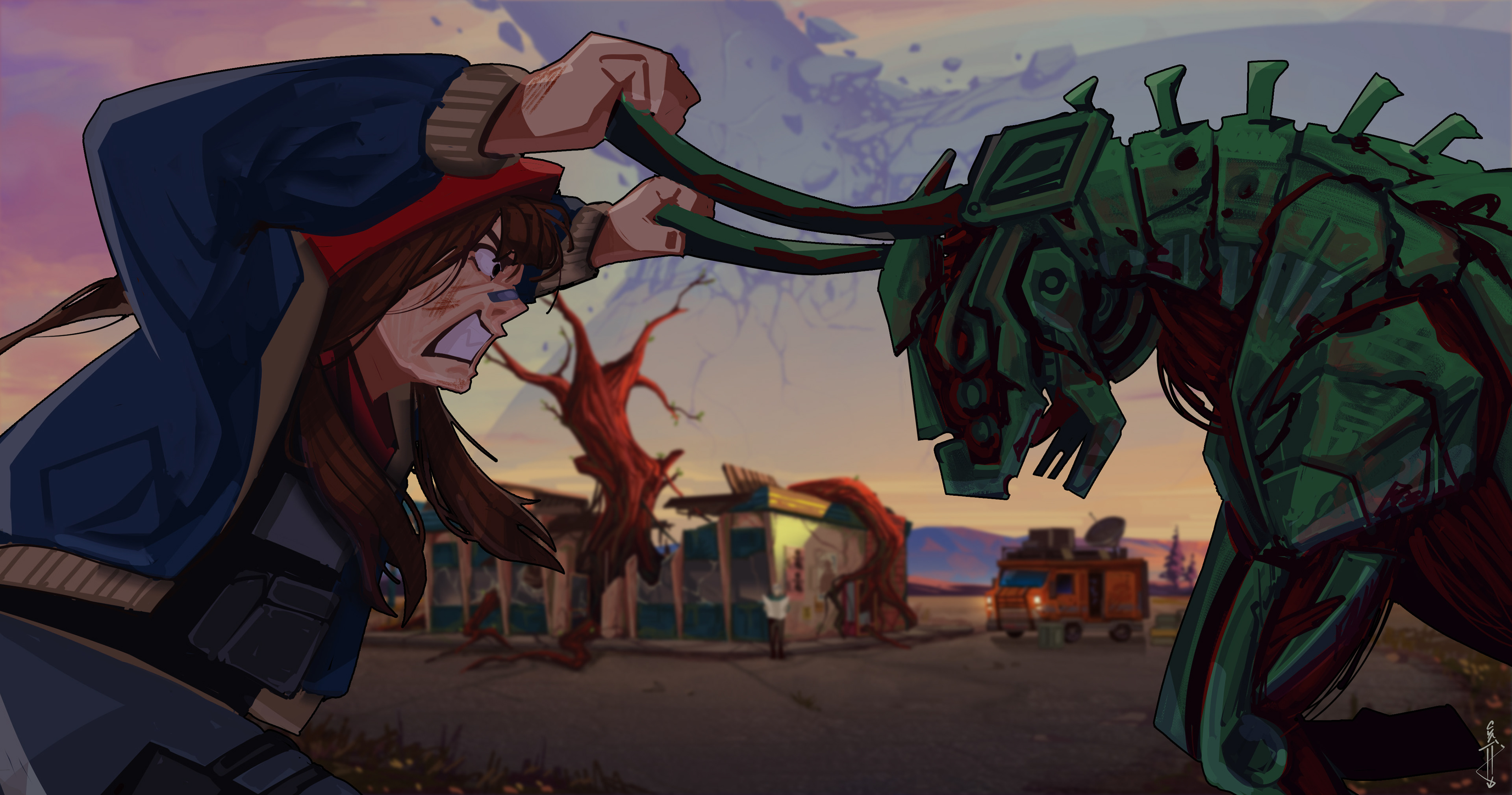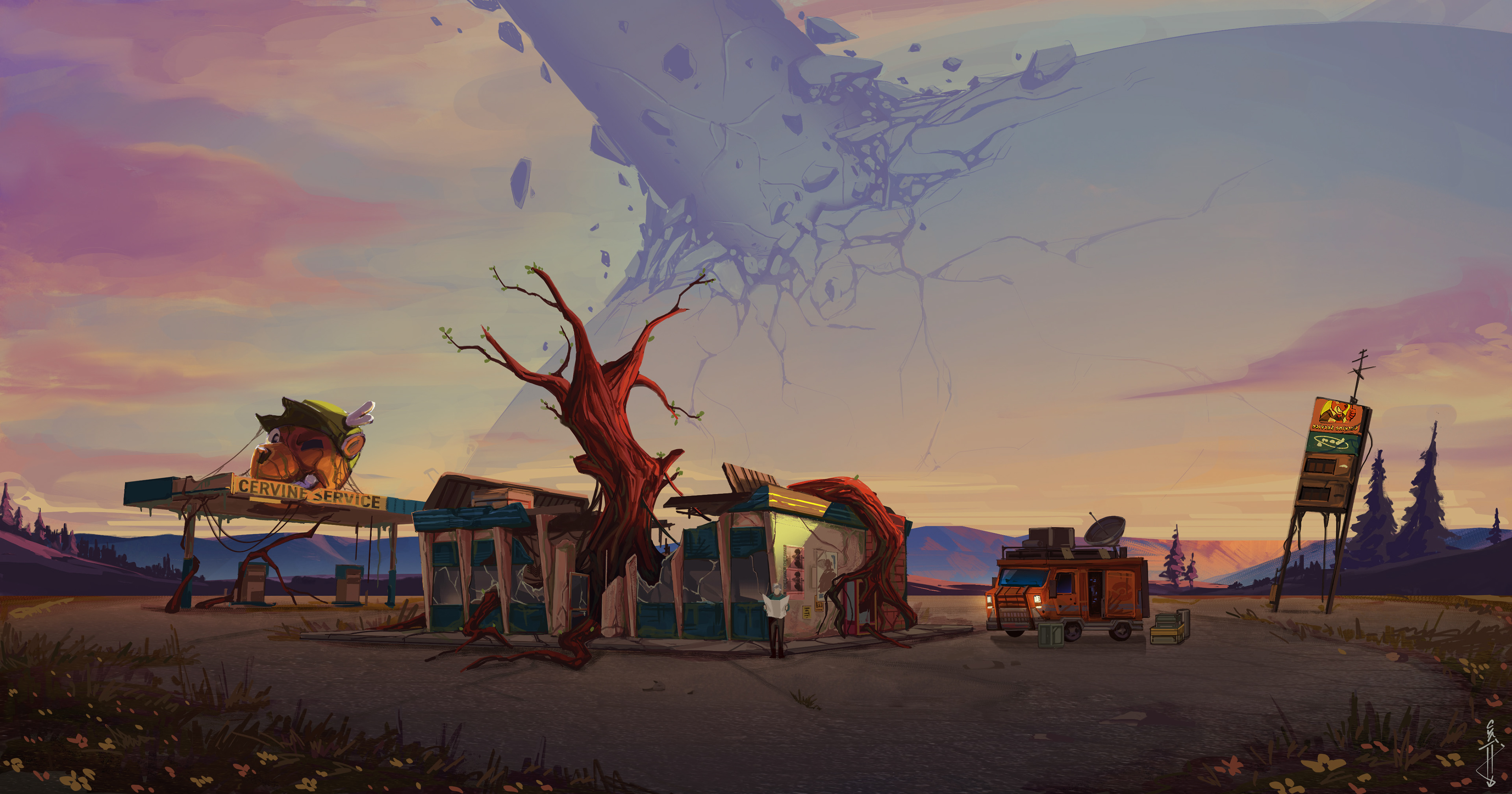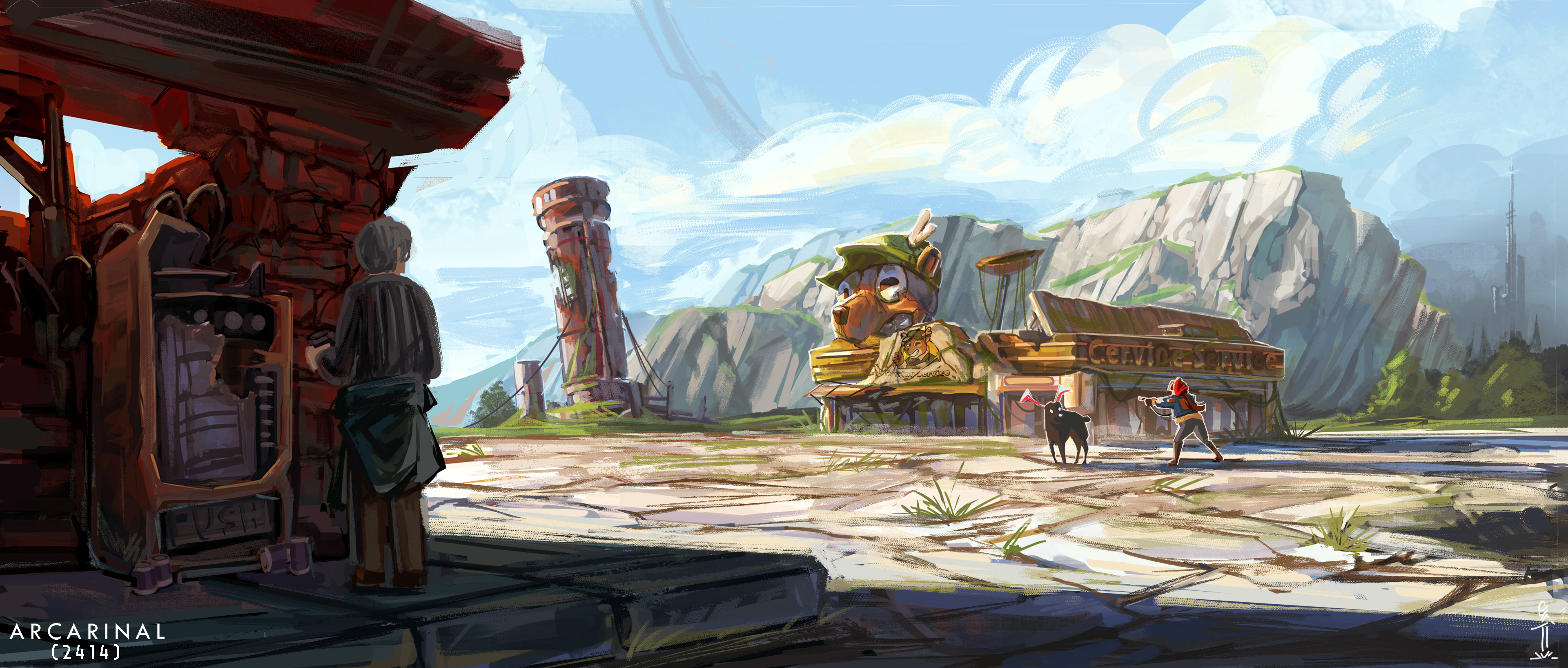 Arcardinal (2414) is a world-building and mock game about recording a documentary in a futuristic post-war Midwest America in 2414. The landscape is terraformed by centuries of war, machines endlessly roam the ruins of the Midwest, and two survivors, Micah the Cameraman, and Alea the reporter, venture into the wastelands to find the truth about the war that happened with their unconventional styles of journalism.