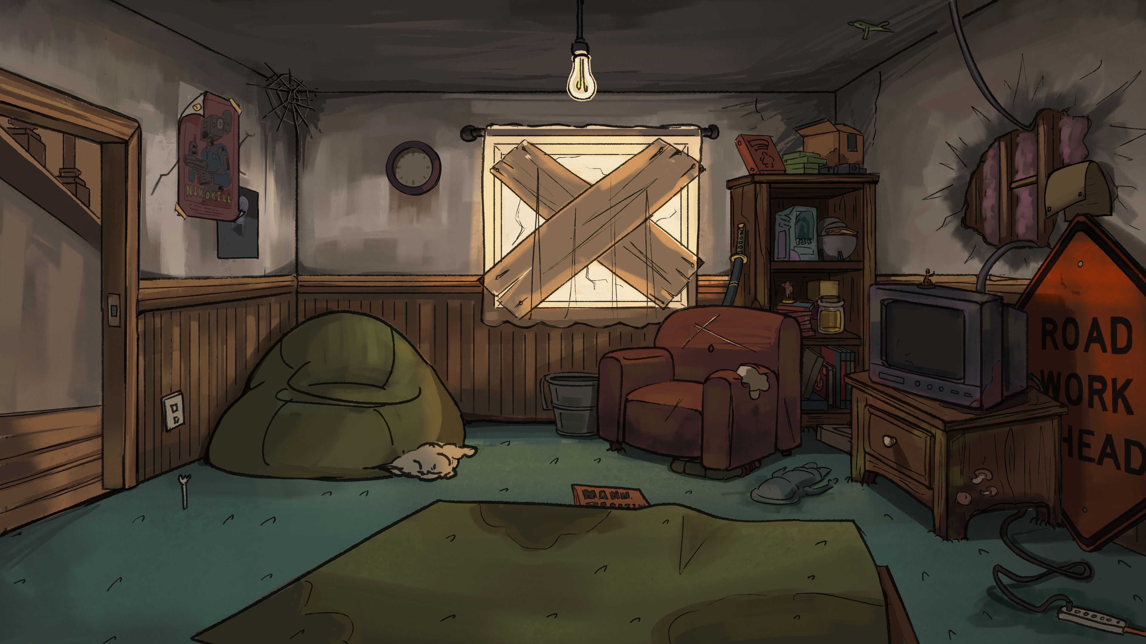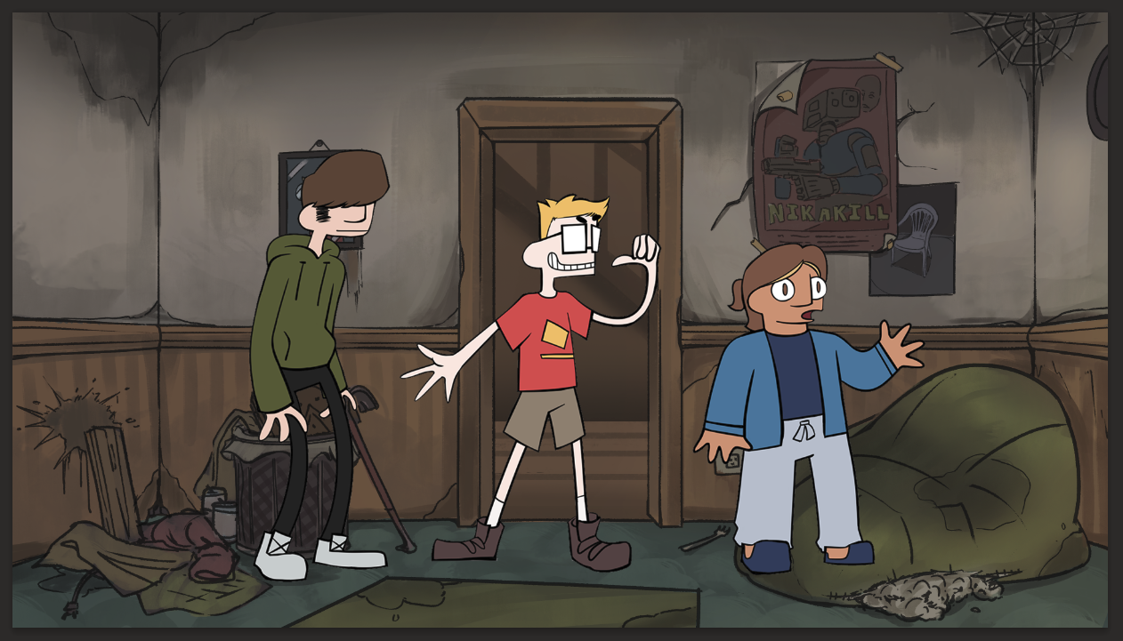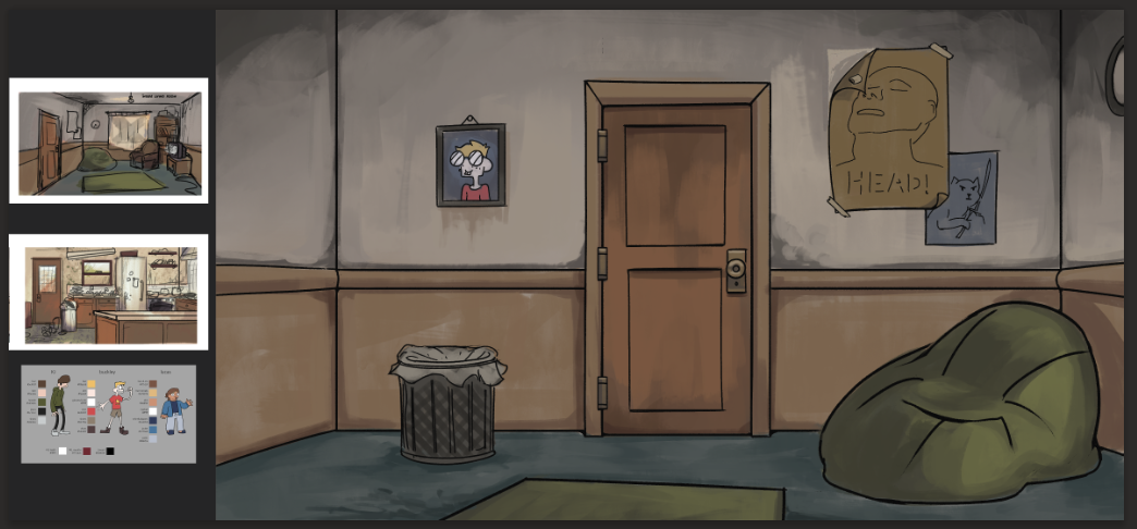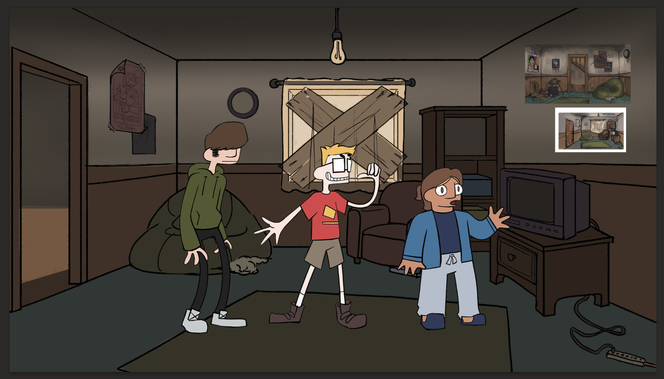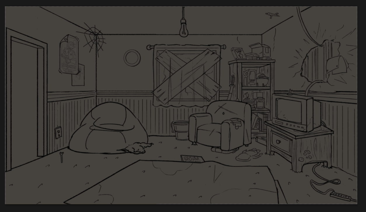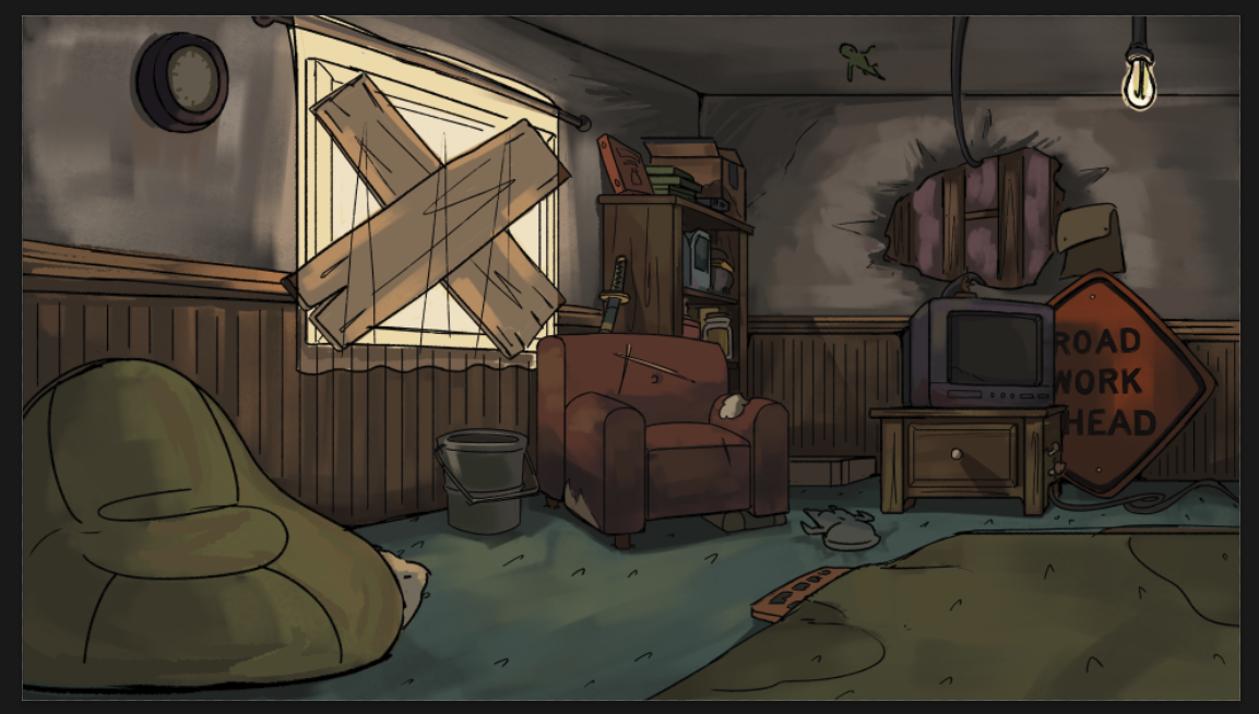 As a background artist still working with Turning Green Productions, I've been tasked with creating three different views of the living room in its run-down state while decorating it with pop culture and game references that speak to the trio's interests in internet culture.