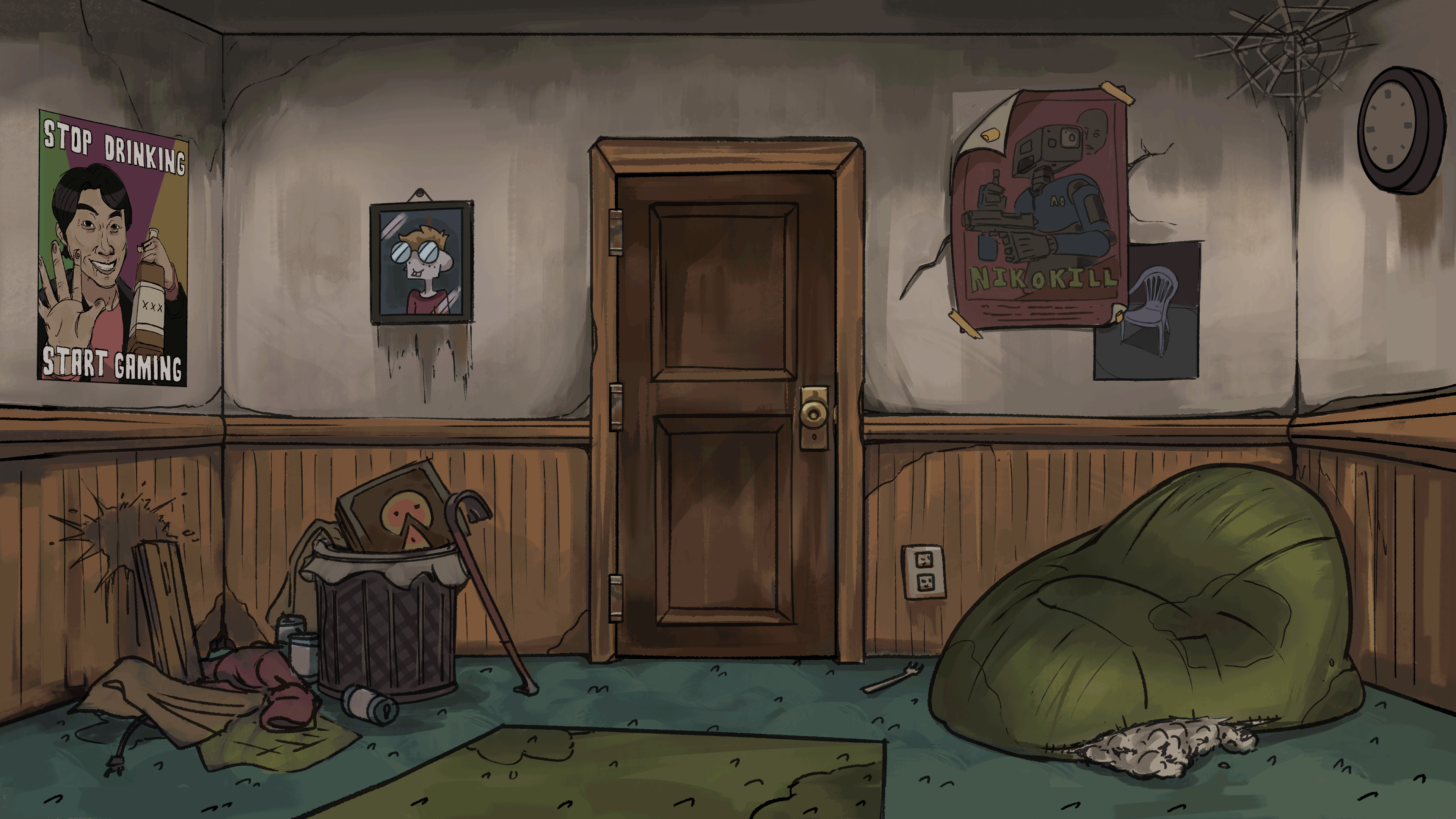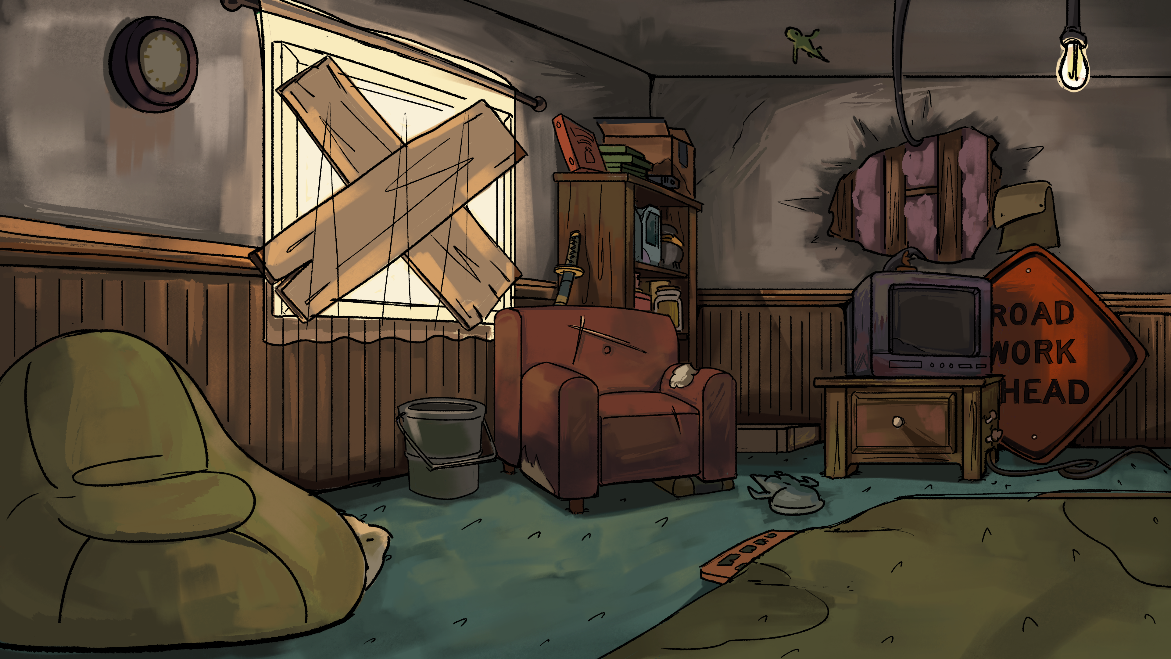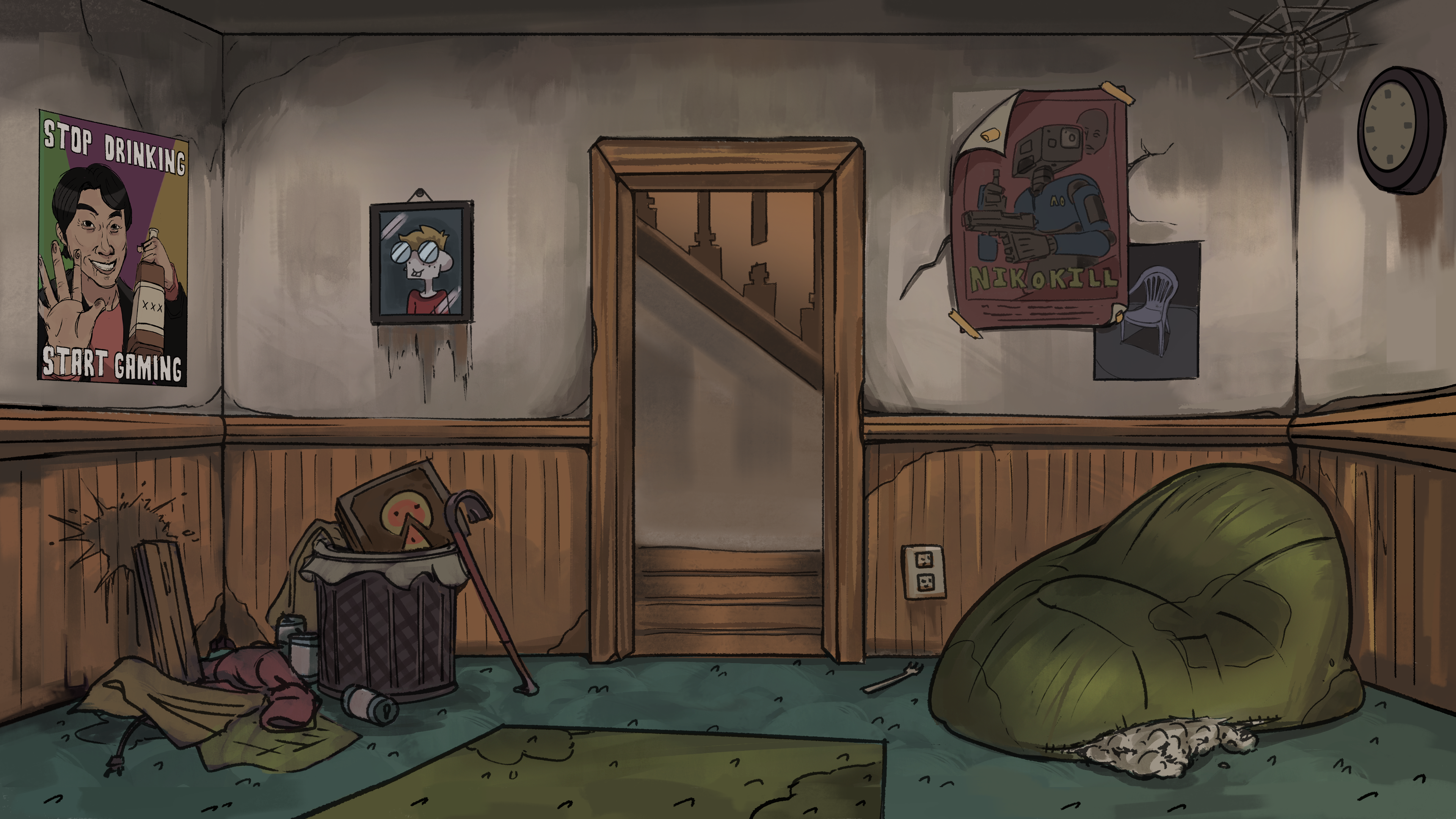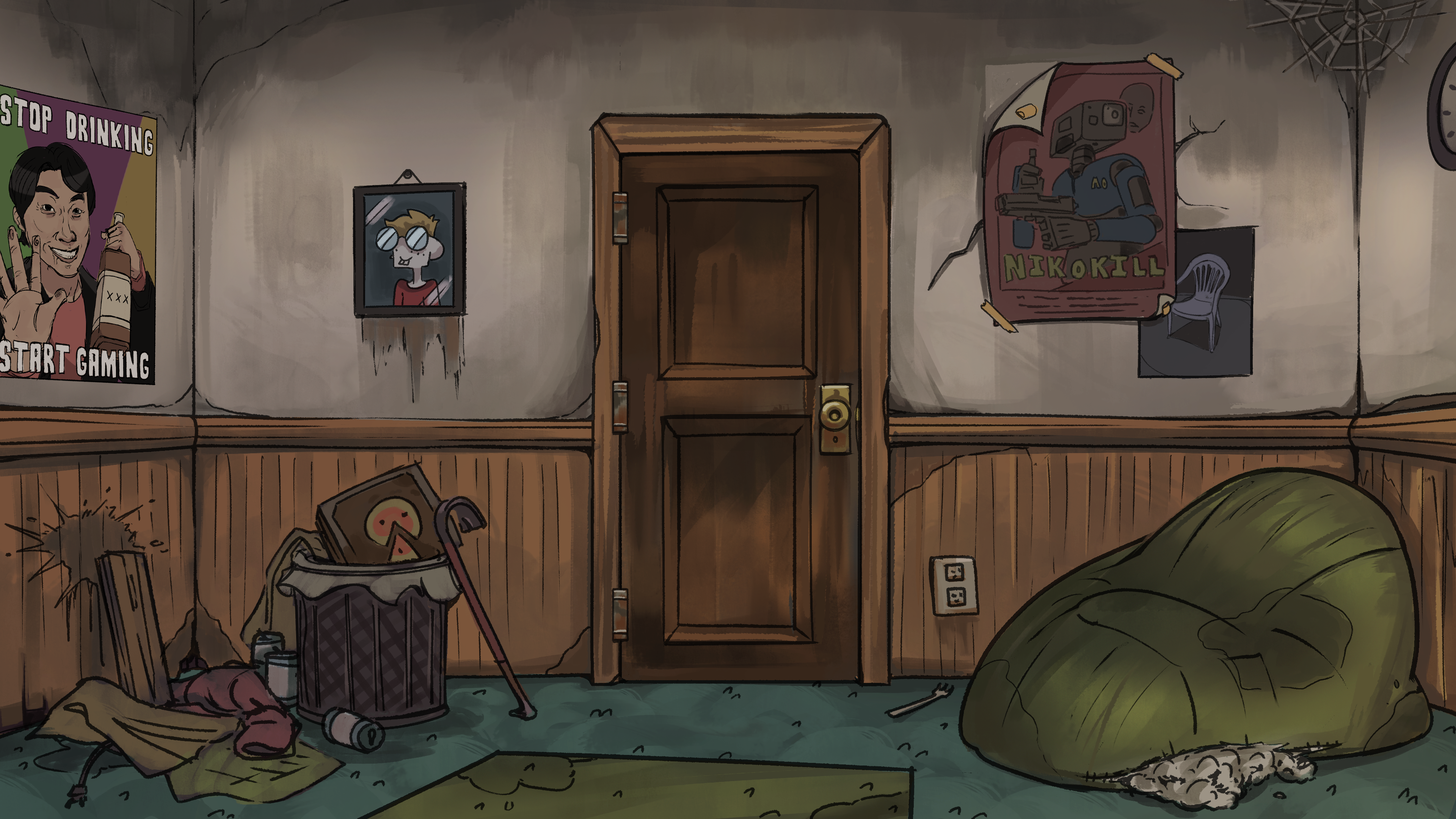 As a background artist still working with Turning Green Productions, I've been tasked with creating three different views of the living room in its run-down state while decorating it with pop culture and game references that speak to the trio's interests in internet culture.