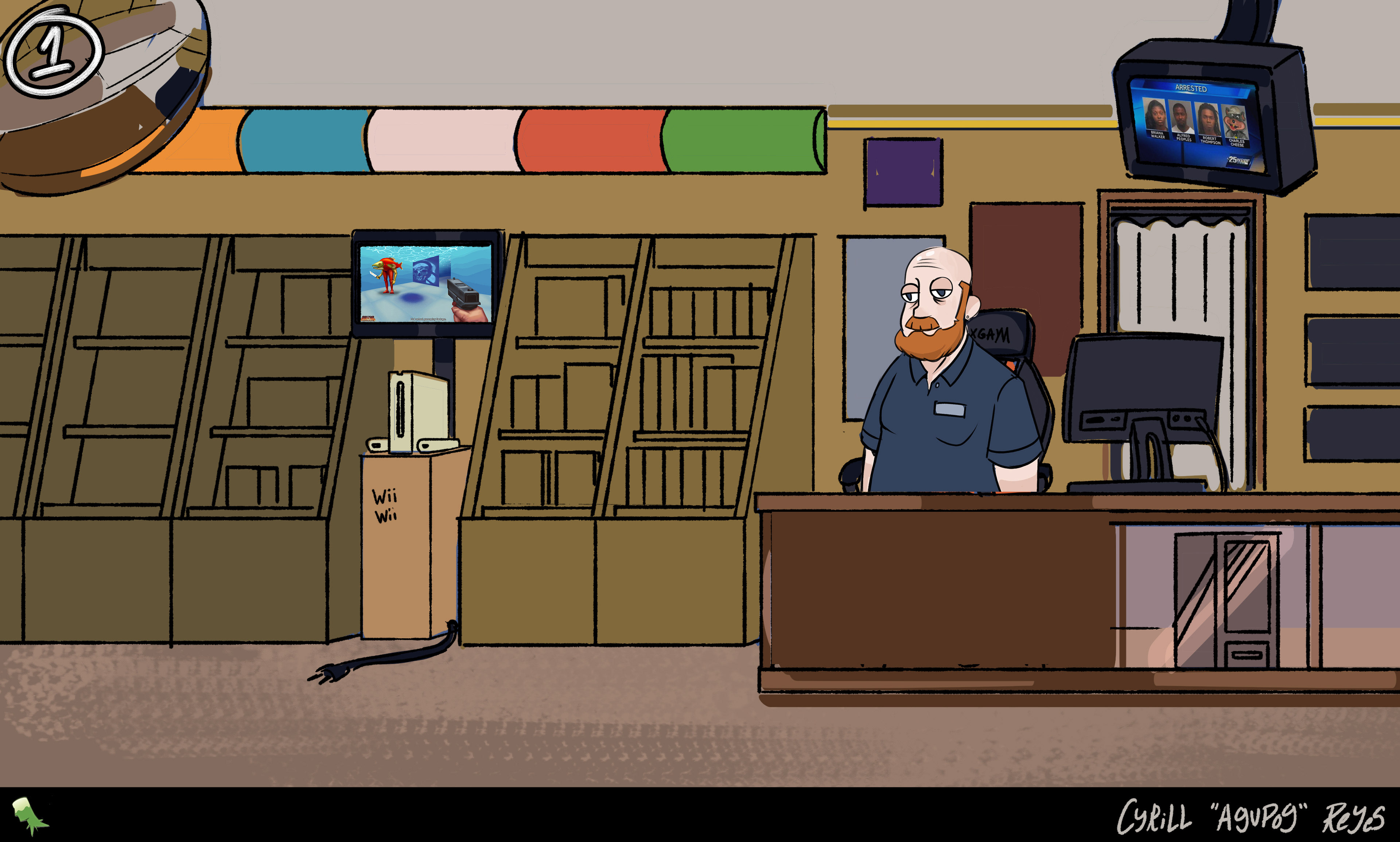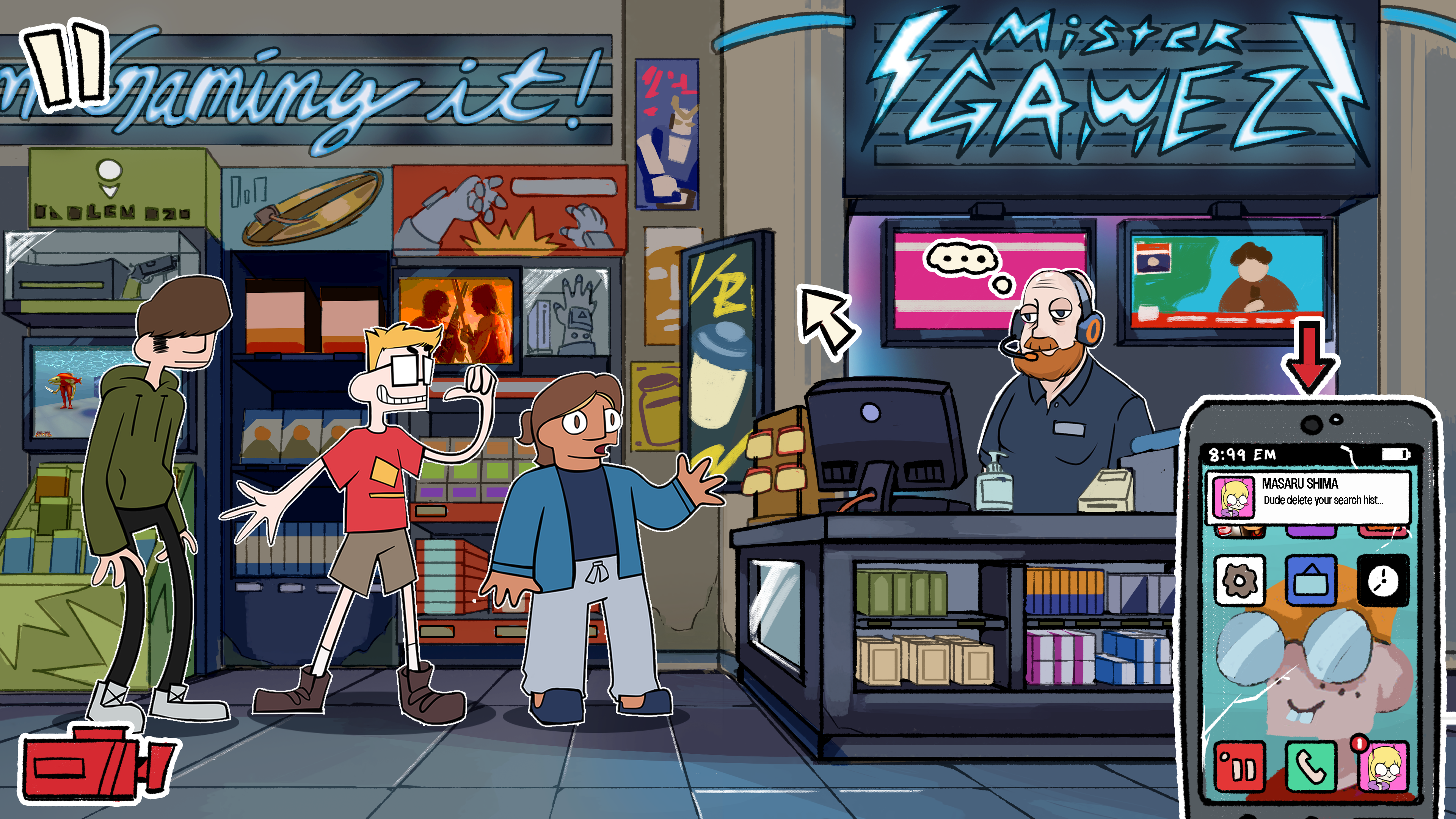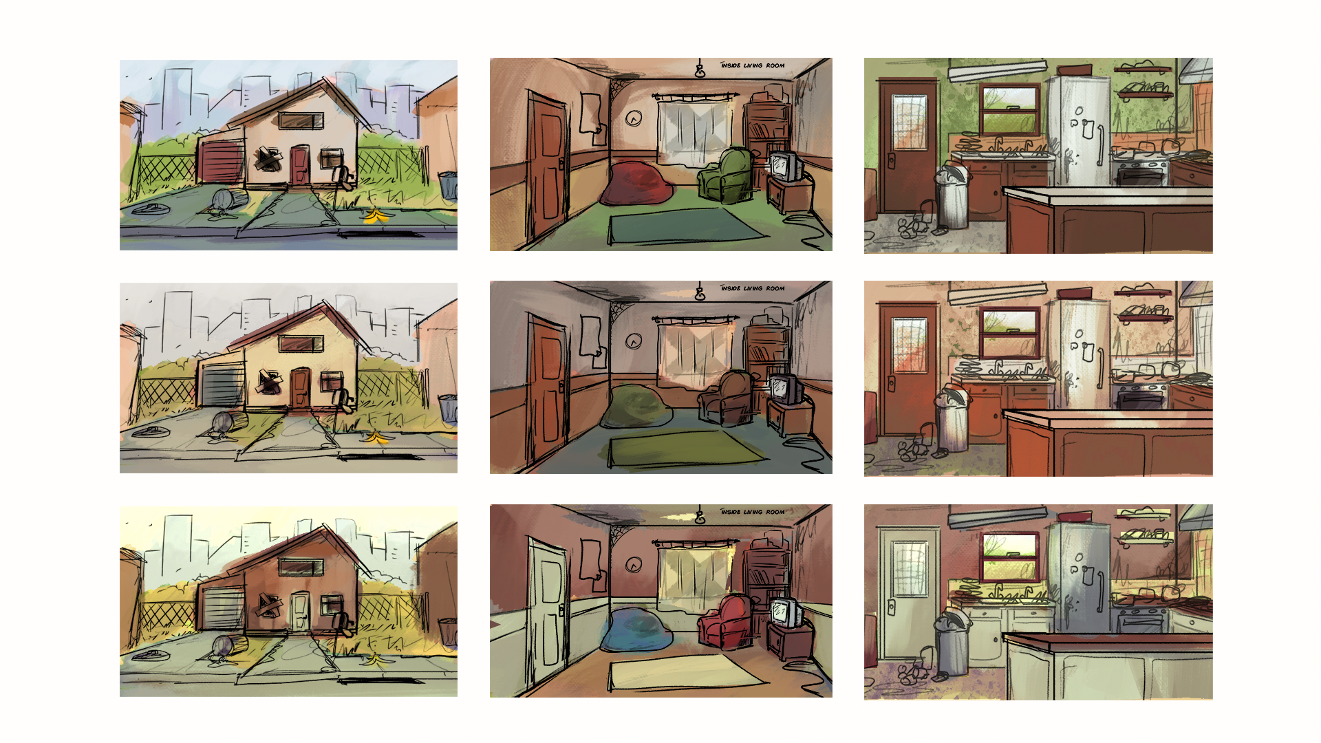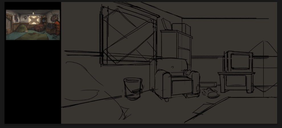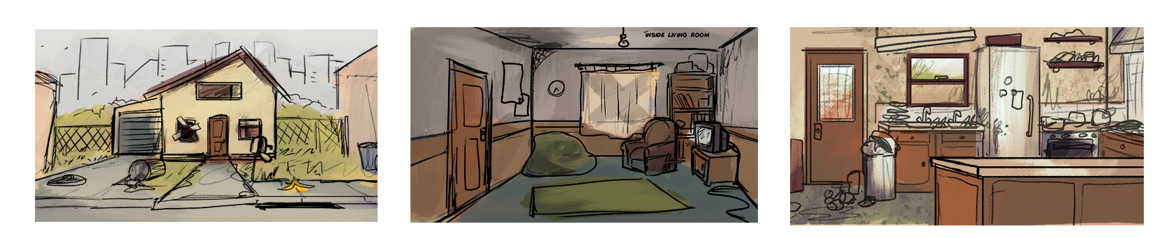 As a background artist still working with Turning Green Productions, I've been tasked with creating three different views of the living room in its run-down state while decorating it with pop culture and game references that speak to the trio's interests in internet culture.